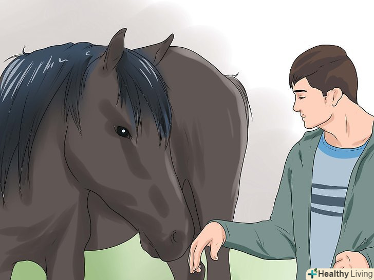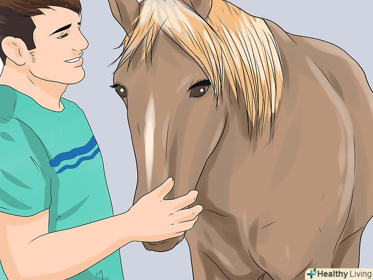 Приголубити коня. перш ніж переходити до виконання будь-яких операцій з конем, скористайтеся моментом, щоб продемонструвати тварині свою любов і привести його в більш комфортний стан. Підійдіть до плеча коня, продовжуючи розмовляти з нею. Переконайтеся в тому, що вона вас бачить і при цьому дивиться на вас м'яким миролюбним поглядом. Ласкаво погладьте їй шию, плече і гриву. Коли Кінь розслабиться, ви можете поступово перемістити ласки на тіло у напрямку до крупу. Пестячи коня, тримайтеся подалі від таких чутливих областей, як очі, ніс і рот.- Використовуйте розтираючі або ласкаві почухують руху, ніколи не пошлепивайте і не постукуйте коня, більшості коней це не подобається. [8]