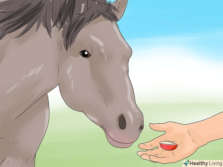 Якщо у вас є з собою частування для коня, дайте їй невеликий шматочок (за умови, що вам це дозволив її господар). це не є обов'язковим вимогою, але так ви зможете викликати до себе прихильність незнайомої коні. Однією з найбільших небезпек в харчуванні коня є виникнення кольок, що нерідко може бути смертельно, тому заради обережності краще запитати дозволу господаря коня, перш ніж пригощати її чим-небудь.- Кольки можуть провокуватися цілим рядом факторів, включаючи вживання навіть в невеликій кількості тієї їжі, до якої кінь не звикла, на яку у неї є алергія, або яку вона з'їла в невідповідний час. Ряд перероблених продуктів і деякі дикорослі рослини можуть бути отрутою для коня. Також можливо, що власник коня тримає її на особливій дієті або проводить лікування, а деякі види частувань можуть вплинути на засвоєння організмом ліків або харчових добавок. Все це є розумною підставою для того, щоб попередньо запитати дозволу господаря коня на те, щоб дати їй якесь частування.