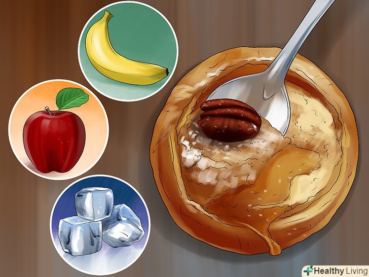 Приготуйте яблуко в банановій глазурі. для цих ласощів вам знадобиться яблуко, банан і жменю кубиків льоду. Насамперед почистіть і наріжте банан. Змішайте в блендері шматочки банана з льодом і подрібніть, поки суміш не стане кремовою. Потім відріжте верхівку яблука і акуратно видаліть середину.- Ложкою перелийте бананову суміш в яблуко.