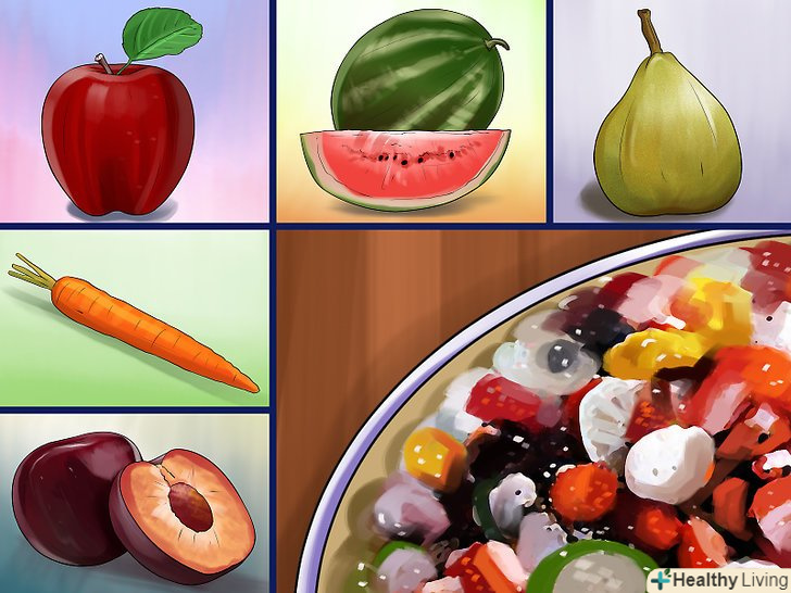 Приготуйте фруктовий салат. якщо ви хочете зробити що-небудь солодше, приготуйте салат з фруктів. Для цього салату вам знадобиться 2 груші, 1 яблуко, 4 моркви, чверть кавуна і 1 слива. Наріжте все це на маленькі шматочки і добре все перемішайте. Додайте повну ложку риб'ячого жиру і ще раз перемішайте.- Так ви приготуєте достатньо салату для декількох коней.