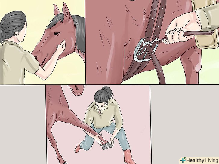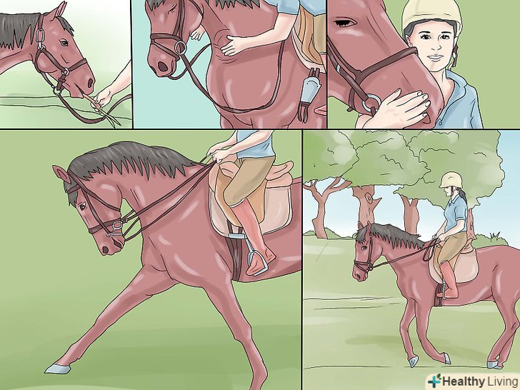 Заберіть свого коня з загону. важливо перевірити коня, перш ніж починати їздити. Рукою помацайте коня скрізь, починаючи з нижньої частини ніг і копит до плечей, а потім до шиї. Потім продовжуйте вниз по спині і під підпругу, а потім по спині і заднім ногам. Ви, можливо, знайшли делікатне місце, де ваш кінь може спробувати збити. Ваш кінь може також не любити підпругу. Майте це на увазі, сідла кінь.