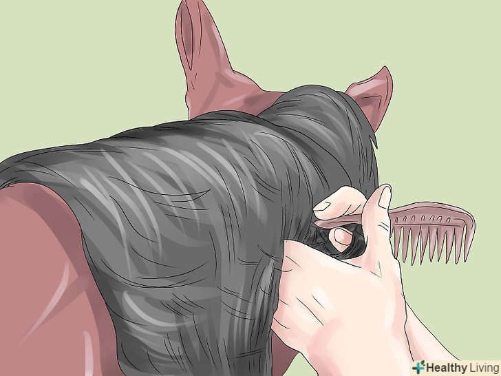 Використовуйте гребінь для гриви, обережно вичісуйте всі колючки з гриви. Використовуйте щітку для хвоста, хвіст чесати щіткою тільки в разі потреби, тому що це витягує довге гарне волосся, які ростуть багато місяців. Використовуючи губку, очистіть область навколо очей коня, видаліть будь-яку суху слиз і траву. Використовуйте другу губку для чищення навколо сідниць, видаліть будь-які плями і присохлий гній. Нарешті, використовуйте білу тканину, натріть коня по зростанню її вовни. Тканина буде збирати бруд, і ви зможете побачити, наскільки добре зробили свою роботу з очищення. Якщо Кінь кусається або хоче вкусити під час догляду, шльопніть її по заду і Підвищіть тон. Ви повинні почати з попередження, наприклад, різкого " Ехх!".