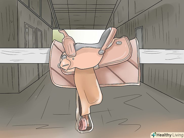 Знайдіть сідло і тканину. Ви повинні мати це напоготові, перш ніж забрати вашу коня з загону. Обережно покладіть своє спорядження на коня. Якщо Кінь брикається, відступите назад, але як і раніше тримайте вальтрап на ній. Після того, як сідло займе правильне положення, візьміть сідло і акуратно покладіть його на вашу коня. Ще раз, якщо ваша кінь кусається або хоче вкусити, гаркніть і при необхідності вдарте коня рукою по плечу і шиї. Це друге попередження.