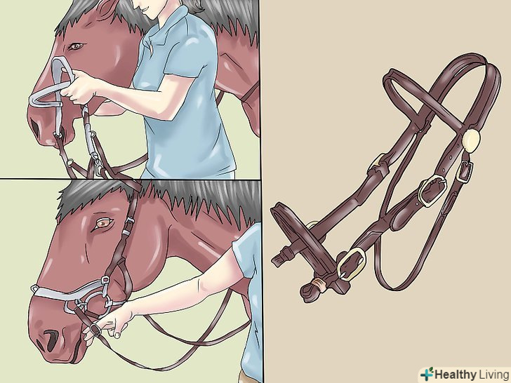 Одягніть вуздечку на коня, переконавшись, що ремінці не потрапили на очі. коли вуздечка виявиться на ній, переконайтеся, що грива і чуб не потрапили під лобовий ремінець. Перед тим як привести в порядок будь-які ремені, переконайтеся, що все правильно встановлено, так як Кінь може розсердитися і побрикнути, якщо щось затискає його. Повинна бути одна зморшка або' посмішка ' в кожному куточку рота. Тепер можна застебнути ремінь під носом і шийний ремінець. Тепер ви зможете сісти на коня.