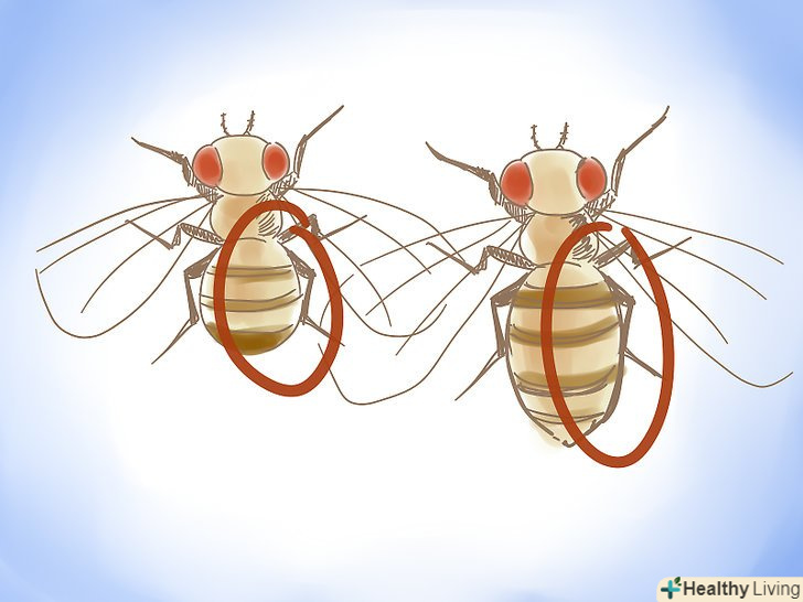 Подивіться на розмір мушки. це перший і самий основний крок. Самки як правило набагато більше самців. Якщо ви подивитеся на анімацію зверху, то побачите, що самки приблизно на 25% більші за самців. Але цей метод не завжди є на 100% точним, тому варто звернути увагу і на інші моменти.