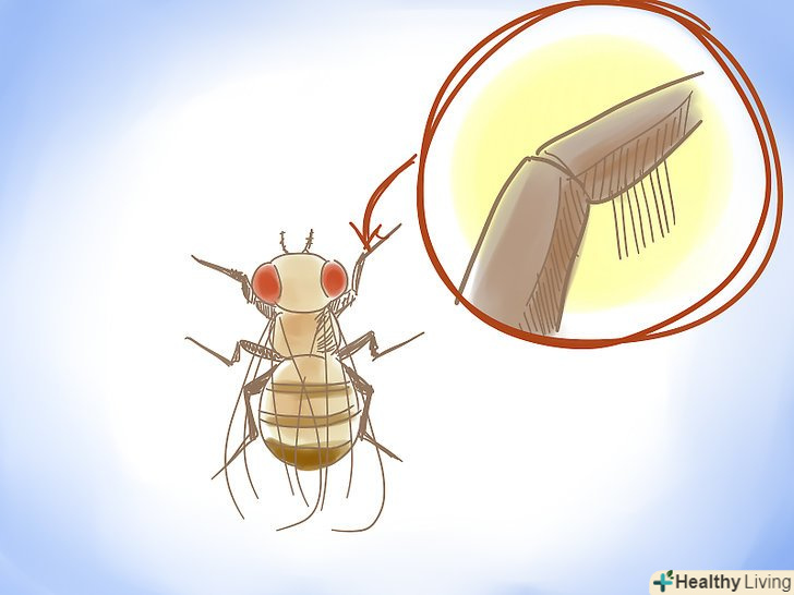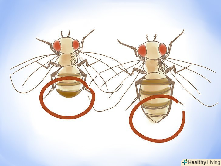 Щоб точно розглянути мушок, використовуйте мікроскоп. щоб точно визначити, самець це чи самка, подивіться черевце дрозофіли під мікроскопом. Немає необхідності розглядати мушку під великим збільшенням. Буде абсолютно достатньо збільшення в 10 разів. Наведіть мікроскоп на мушку і постарайтеся розглянути чорні лінії і тоненькі щетинки біля лапки мушки. Такі щетинки потрібні самцеві, щоб утримувати самку під час спарювання.