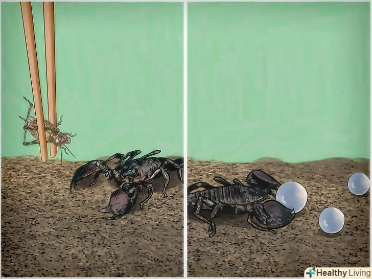 Дотримуйтеся здорового харчування для Скорпіона. годуйте його живими цвіркунами, сараною, борошняними хробаками. Для Скорпіона дитинчати підійдуть свічки з шпилькову головку і інші дрібні комахи. [10]- Комахи заздалегідь повинні бути вигодовані вітамінізованою сумішшю, доступною в зоомагазинах, (відома як»gut-loading"). [11]