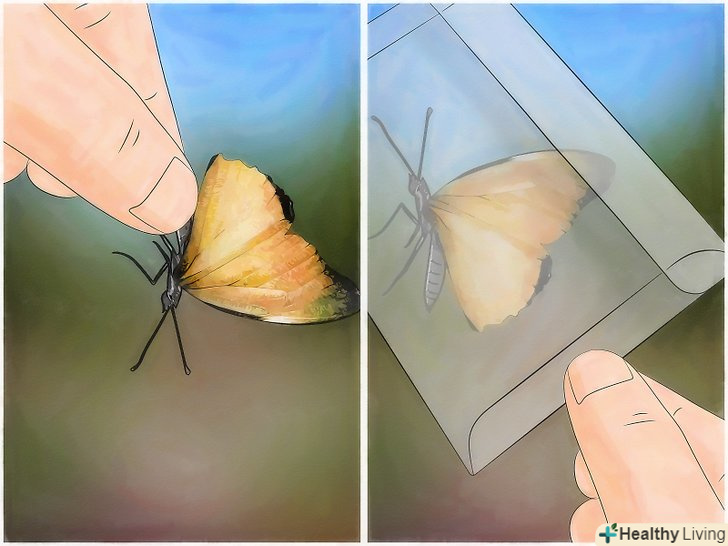 Візьміть метелика. при необхідності можна взяти метелика рукою. Для цього акуратно візьміться над самим тільцем за складені разом крила. Це не зашкодить метелику, якщо тільки вона не дуже тендітна. Наприклад, у монархів досить міцні крила. Можна також перевернути метелика вгору тільцем, щоб вона заспокоїлася. [10]