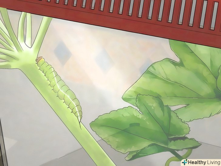 Помістіть зібраних гусениць у відро з їжею. у 20-літровому відрі можна містити від 5 до 10 гусениць. Необхідно помістити у відро достатню кількість їжі для гусениць, наприклад листя молочаю. Якщо гусениці їдять кілька видів рослин, урізноманітніть їх раціон. Крім того, слід прикрити відро повітропроникною кришкою, щоб випорожнення гусениць висихали і не шкодили їм. [18]- Можна використовувати і меншу ємність — головне, забезпечити нормальну вентиляцію.