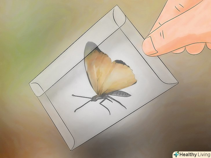 На час відкладіть метелика. спійманих метеликів можна складати в конверт з кальки-такі конверти використовують для зберігання поштових марок і монет. Ці конверти напівпрозорі і зроблені з вощеного паперу. Можна також використовувати невеликий трикутний конверт. [11]- Не забудьте написати на зовнішній стороні конверта всю необхідну інформацію. Використовуйте для цього незмивні чорнило.