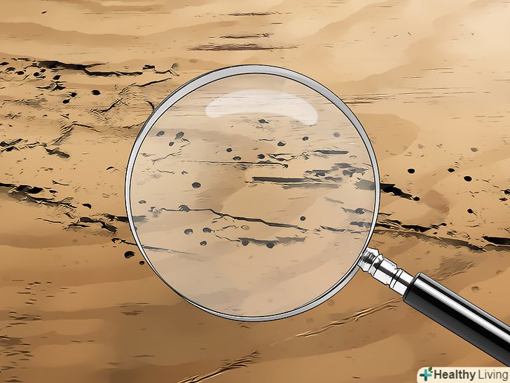 Знайдіть опуклості, отвори або нерівності. огляньте деревину ліхтариком, особливо темні кути. Не світіть ліхтариком прямо на поверхню дерева. Замість цього покладіть його на деревину, щоб світло падало рівно і ви могли розрізнити опуклості, отвори або хвилеподібні нерівності на поверхні дерева. Все це можна легко прогледіти, якщо дивитися неозброєним оком. [3]