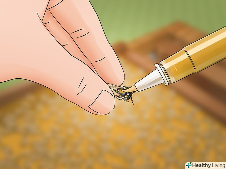Підготуйте все необхідне для маркування. не тримайте бджолу занадто довго, щоб не засмутити і не травмувати її. Перш ніж взяти королеву в руки, візьміть потрібну фарбу для маркування. Занурте пензлик або маркер у фарбу і тримайте її напоготові в руці або на невеликому столику поруч з вуликом. [9]