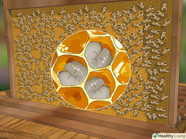 Знайдіть личинку. обережно зніміть кожну рамку вулика і знайдіть личинку. Вони схожі на маленьких білих гусениць і зазвичай знаходяться в купі серед інших личинок. Оскільки всі яйця в колонії відкладає королева, вона теж повинна бути неподалік.- Будьте дуже обережні, коли будете знімати рамки для вулика, щоб ненароком не вбити королеву.