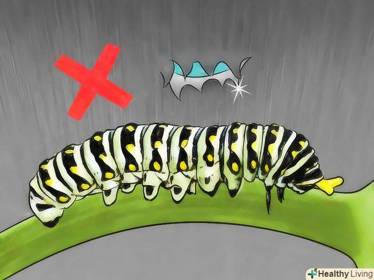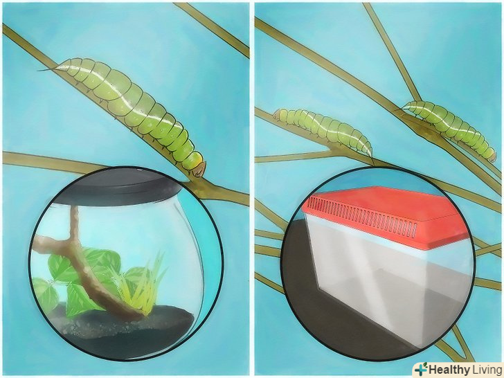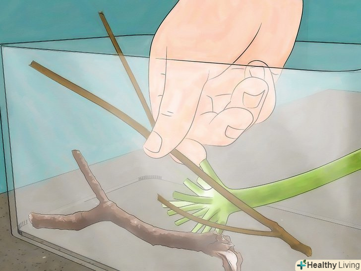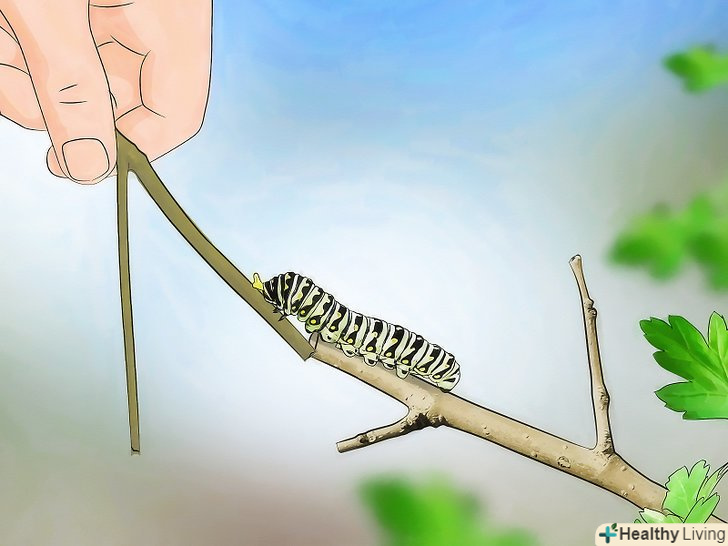 Помістіть в контейнер палички або гілки. Гусеницям потрібні гілки і палички, щоб по них повзати. Крім того, вони знадобляться, коли гусениці прийде час залялькуватися (гусениця заляльковується, звисаючи з гілки). Додайте в контейнер з гусеницею гілки, і комаха буде відчувати себе як вдома. [13]- Деякі гілки або палички треба поставити вертикально, притуливши їх до стінки контейнера або впершись в кришку, щоб гусениця могла по ним підійматися.