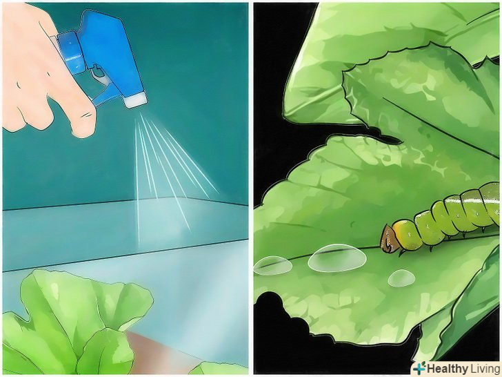 Забезпечте гусеницю водою. гусениць треба постачати водою щодня. Не ставте в контейнер блюдце в водою-гусениця може впасти в нього і потонути. Замість цього щодня обприскуйте листя в контейнері водою з пульверизатора. Декількох крапель гусениці цілком вистачить, щоб втамувати спрагу. [17]- Можна не обприскувати листя з пульверизатора, а просто занурити їх у воду, перш ніж класти в контейнер. Такої кількості води гусениці буде цілком достатньо.