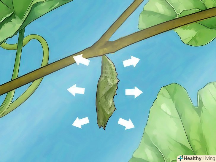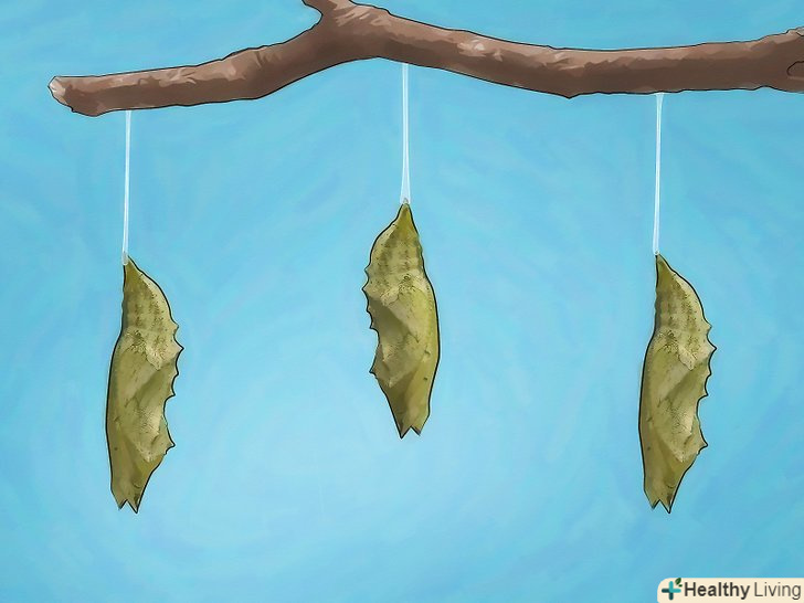 Підвісьте кокон в новому контейнері. Перенести лялечку в новий, більш просторий контейнер можна прямо разом з гілкою, на якій вона висить. Якщо це зробити складно, є кілька способів підвісити кокон на новому місці. [20]- Можна використовувати клей з термоклеевого пістолета. Клей необхідно трохи остудити, щоб він загус, і приклеїти їм гострий кінець кокона до гілки.