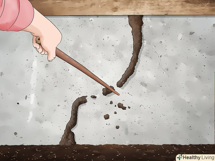 Розбийте грязьові тунелі. для переміщення між ділянками своєї колонії терміти створюють грязьові тунелі. Вони можуть виглядати як ланцюжки або лінії бруду на стіні або фундаменті. Зламайте тунель, щоб побачити, чи є в ньому терміти. Навіть якщо тунель порожній, це не означає, що в будинку немає термітів. [7]