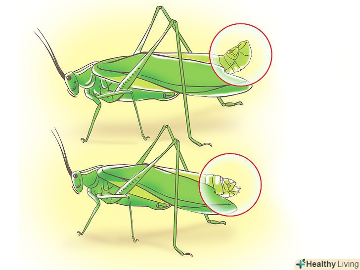 Подивіться на задню частину тіла коника, щоб визначити стать.- Коник жіночої статі має конічний живіт. Ви можете побачити загострення у вигляді трубки для відкладання яєць, науково відомої, як"яйцеклад". Зображення показує, як виглядає кінцева частина самки коника.
