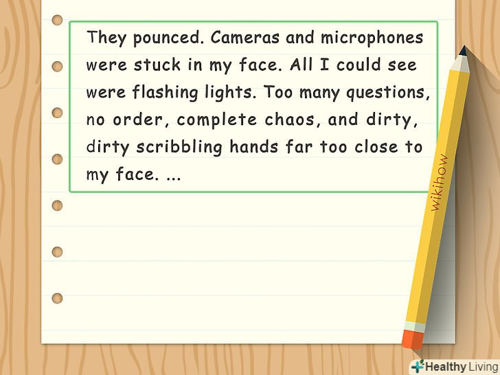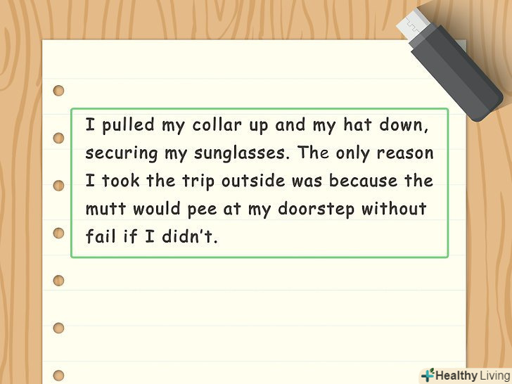 Увімкніть чуттєве детальний опис місця дії.Подумайте про те, що відчуває, чує, відчуває на смак і запах, а також бачить головний герой. Опишіть місце дії з точки зору людських почуттів, щоб воно ожило в очах читача.[16]- Наприклад, будівля старої середньої школи можна описати як " гігантське, схоже на фабрику будова, від якого пахне пітною спортивною формою, лаком для волосся, розбитими мріями і крейдою». Або ж можна описати небо над дахом свого будинку як " біле простирадло, покрите густим сірим серпанком від пожеж, які розповзлися з ранку по довколишньому лісі».