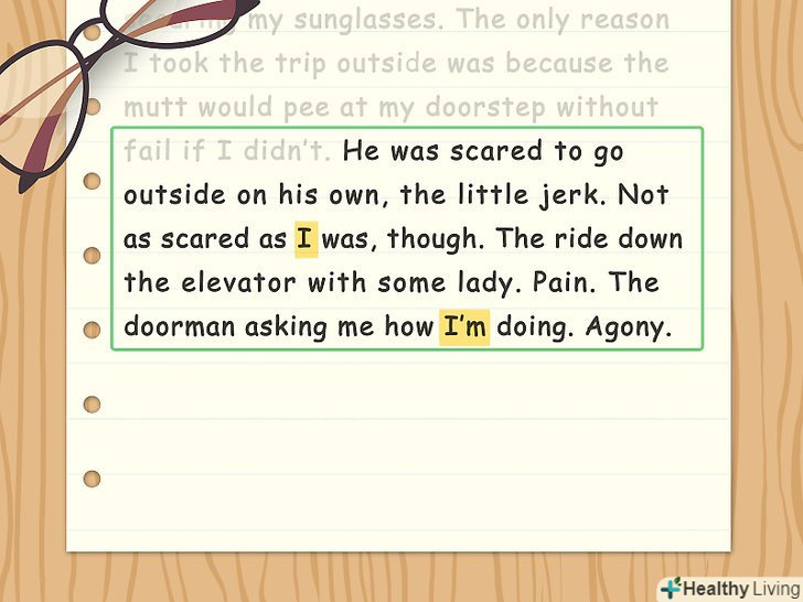 Дотримуйтеся одного ракурсу розповіді.короткі оповідання зазвичай викладаються від першої особи, і такий ракурс розповіді залишається незмінним. Це допомагає надати історії чіткий фокус і перспективу. Також можна спробувати написати розповідь від третьої особи, однак, цим можна дистанціюватися від читача.[14]- Іноді зустрічаються розповіді від другої особи, в яких автор використовує займенник «ти». Це зазвичай робиться в тому випадку, коли застосування другої особи є істотно важливим для письменника, як в повісті Теда Чана «Історія твого життя» або в оповіданні Хунота Діаса «Ось чому ти її втратив».