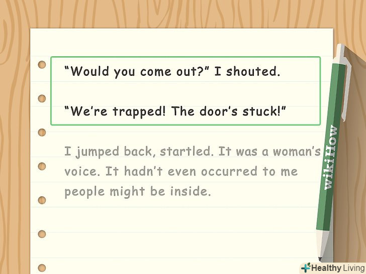 Використовуйте діалоги, щоб краще розкрити характер персонажа і подальший розвиток сюжету.діалоги в коротких оповіданнях завжди повинні виконувати більше однієї функції. Переконайтеся в тому, що діалог повідомляє читачеві що-небудь про того персонажа, який говорить, і доповнює собою історію розвитку сюжету. Включіть в діалог такі пояснення, які будуть розкривати персонажа, а також додадуть сцені з діалогом більше напруги і конфлікту.[15]- Наприклад, замість того щоб відкривати діалог фразою " Привіт! Які у тебе новини?", спробуйте написати: "Гей, подруга, що сталося?"- або: "де ж ти пропадав? Сто років тебе не бачив!»