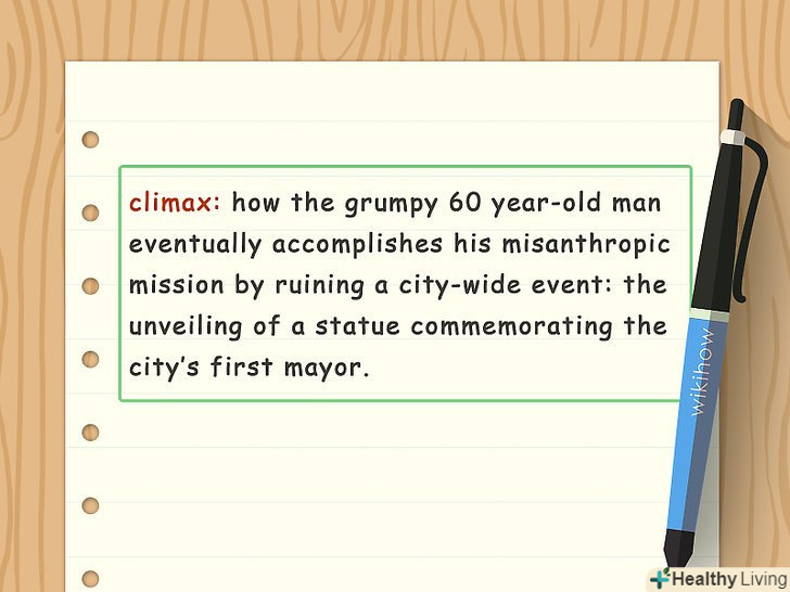 Заплануйте емоційну кульмінацію в оповіданні.у всіх хороших коротких оповіданнях є захоплюючий момент, в якому головний герой досягає найвищої емоційної точки. Кульмінація зазвичай відбувається в другій половині розповіді або навіть ближче до кінця. У кульмінаційний момент головного героя можуть переповнювати почуття, він може відчувати себе в пастці, в розпачі і навіть втрачати контроль над собою.[6]- Наприклад, емоційна кульмінація може наступити тоді, коли Самотній чоловік вступить в конфронтацію з сусідкою з приводу її кримінальної діяльності. Або ж кульмінаційний момент може настати тоді, коли дівчинка-підліток, нарешті, заступиться за свого брата перед обличчям шкільних задир.