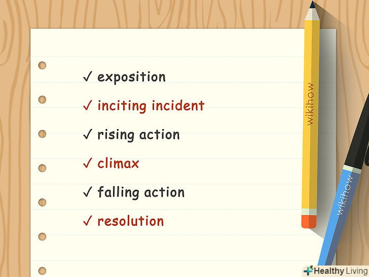 Підготуйте. Організуйте свій короткий розповідь відповідно до сюжетним планом з п'яти частин: експозиція, зав'язка, розвиток подій, кульмінація, згасання подій і розв'язка. Використовуйте цей план як основу написання розповіді, щоб в ньому можна було чітко виділити початок, середину і кінцівку.[12]- Також можна спробувати скористатися методом снігової грудки, коли спочатку дається опис розповіді одним реченням, потім описуються окремі частини розповіді, готується опис всіх героїв історії і готується список сцен з їх участю.