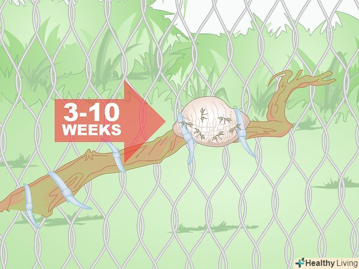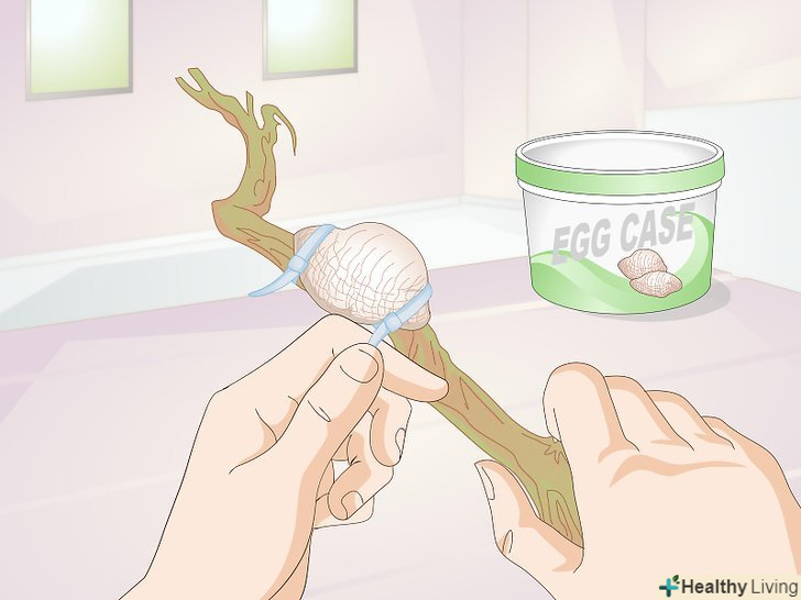 Перенесіть капсулу з яйцями в сад. візьміть невелику гілку і акуратно прив'яжіть до неї капсулу кабельним хомутом, дротом або шнурком. Будьте обережні, щоб не пошкодити капсулу. Потім підшукайте в своєму саду безпечне місце. Знайдіть затишне, приховане від хижаків місце на відстані близько півметра від землі. [17] прикріпіть прутик з капсулою до куща або паркану. [18]- Перш ніж прикріплювати капсулу до гілки, знайдіть щілини, з яких будуть вилазити личинки, або німфи. Прив'яжіть капсулу таким чином, щоб ці щілини були спрямовані назовні. [19]