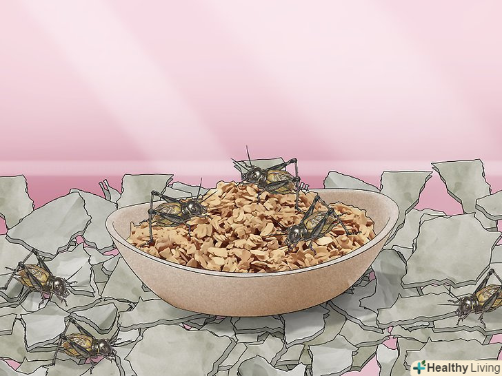 Годуйте цвіркунів вівсяним або кукурудзяним борошном або кормом для цвіркунів. помістіть кукурудзяну або вівсяну муку або корм на блюдо в контейнер. Це буде постійне джерело живлення для ваших комах. Не переживайте-переїдати вони будуть. [7]