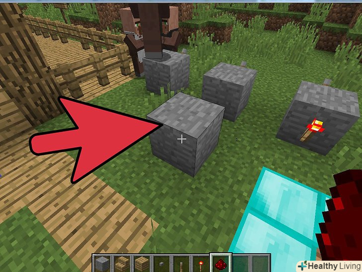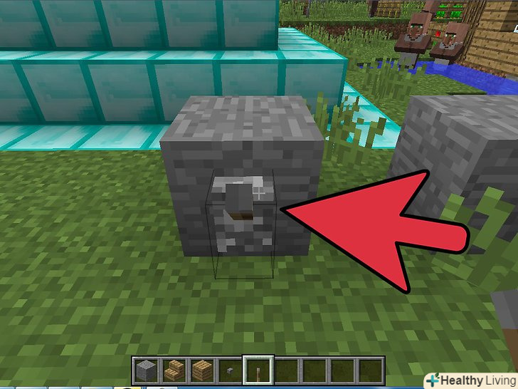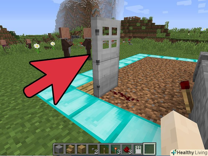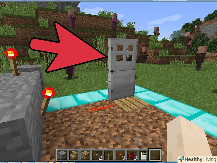 Встановіть першу частину замку.це буде двері-дерев'яна або залізна. Також вам знадобиться кнопка і 2 таблички. Кнопка буде включати електричний струм, за допомогою якого буде відкриватися двері. Табличка буде говорити гостям, як можна відкрити двері.- Будьте обережні при активації пристрою. Кнопка або важіль повинні знаходиться хоча б на відстані 1 блоку від дверей. Інакше двері буде відкриватися не за допомогою комбінацій, а за допомогою самої кнопки.