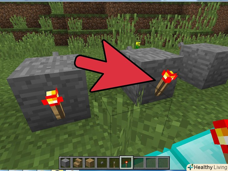 Поставте червоні факели на задню сторону кожного блоку з важелями.це дозволить вам створити код. Не ставте червоні факели на всі боки і на зайві блоки. Важелі на блоці з червоним факелом повинні бути в опущеному положенні, а навколишні важелі - в піднятому положенні, щоб двері відчинилися. Припустимо, що ви поставили важелі 2 і 3 опущене положення.