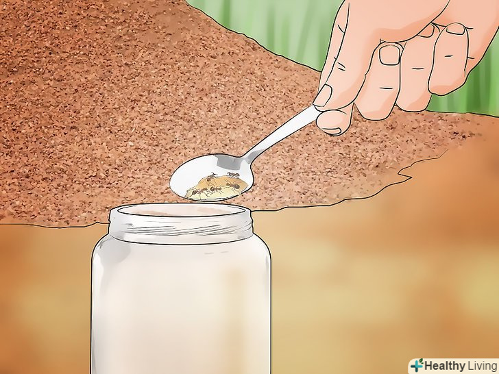 Зберіть мурах. як тільки Ви знайшли колонію мурах, Принесіть банку з проробленими дірочками нагорі (не ту банку, яка потрібна для ферми) і велику ложку, помістіть мурах в банку. 20-25 мурах-достатня кількість для початку. Ось що слід пам'ятати:- Мурахи, можливо, не будуть розмножуватися, поки ви не помістите королеву мурах на ферму. Саме вона відкладає всі яйця. Купка робочих мурах на поверхні, швидше за все, безплідна. Тому, якщо ви хочете побачити процес відкладання яєць, вам знадобитися королева. В цьому випадку, вам, найімовірніше, доведеться зруйнувати природну колонію.