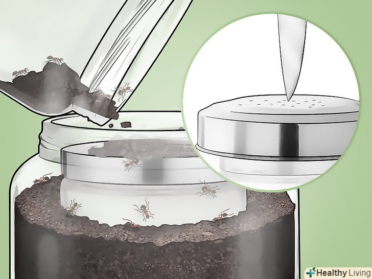 Помістіть мурах в банку і накрийте її кришкою. обережно розміщуйте мурах; переконайтеся, що всі вони потрапили на землю. Закрийте банку кришкою і за допомогою шила або ножа виконайте в кришці дірочки, щоб в банку надходив кисень.- Не робіть дірочки занадто великі, інакше мурахи виберуться і побудують мурашник в іншому місці.