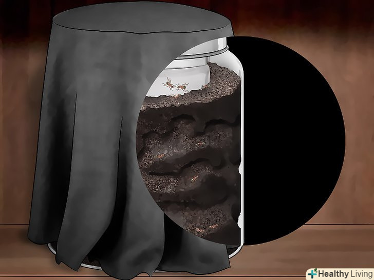 Закривайте банку, якщо не спостерігаєте за мурахами. мурахи риють тунелі вночі, в темряві. Щоб відтворити природне середовище проживання, накрийте банку чорною хусткою або картонкою. Якщо ви забудете це зробити, мурахи будуть перебувати в постійному стресі і втратять активність. Крім того, вони схильні перебувати більшу частину часу в центрі банки, а не біля скла.