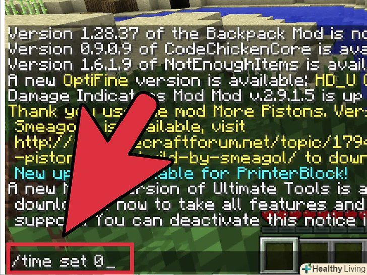 Введіть команду для маніпуляції грою.- Наприклад, введіть "/ time set 0", щоб поміняти час доби на світанок.