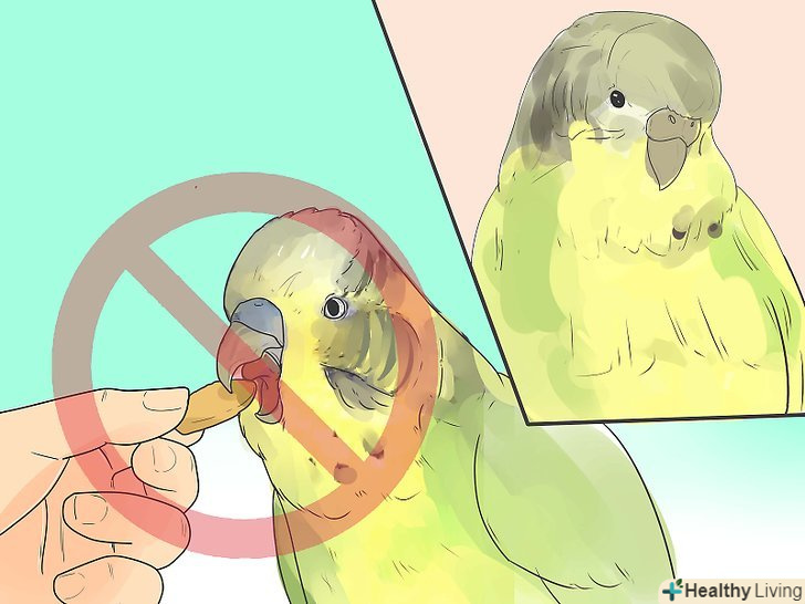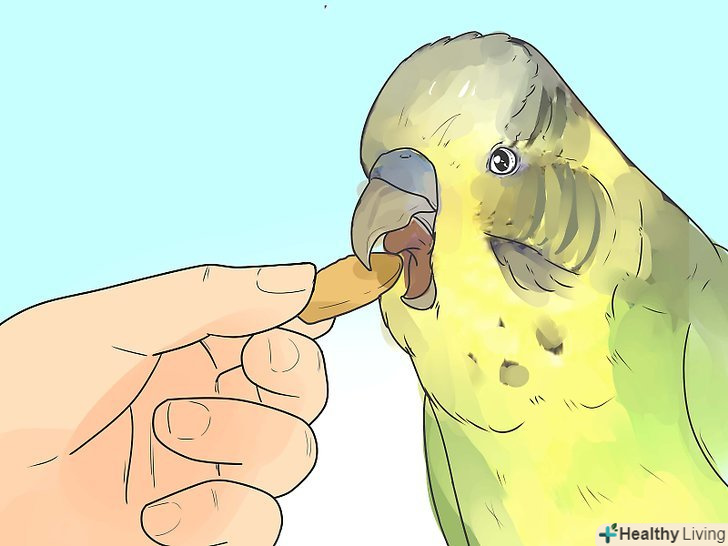 Усунення проблем з годуванням. якщо ваш хвилястий папужка не їсть фрукти, овочі або інший вид їжі, поріжте овочі і складіть їх в порожню чашку для годування. Повісьте чашку в клітці. Над нею прикріпіть кілька листочків зелені або інших улюблених ласощів. Робіть так кожен день, поки не переможете папужки остаточно.