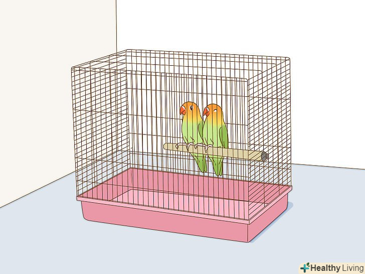 Придбайте все необхідне для розміщення і розведення нерозлучників. у природі нерозлучники зазвичай селяться в дуплах дерев, в отворах скель або ж в кущах. Придбайте все необхідне для нерозлучників, щоб вони комфортно себе почували і могли успішно розмножуватися. [9]- Купіть нерозлучникам клітку розміром не менше 45 см х 45 см х 30 см з відстанню між прутами не більше 2 см.постарайтеся знайти клітку саме кубічної форми, щоб при бажанні у птахів була можливість забитися в куточок і сховатися там. [10]