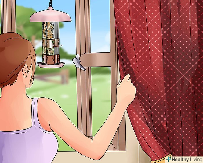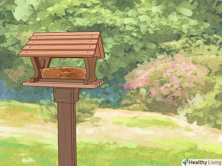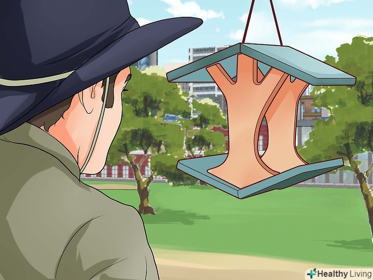 Встановіть годівницю. існують різні методи установки годівниць, які багато в чому залежать від типу самої годівниці. Годівниця може бути підвішена на гаку, встановлена на стовпчику, повішена на дереві, поставлена на плоскій піднесеній поверхні. Деякі види годівниць можна кріпити до вікон, що дозволяє ближче розглянути птахів.- Не забувайте слідувати інструкціям по установці, що додаються до купленої вами годівниці. Якщо ви самостійно виготовили годівницю для птахів, обов'язково надійно її закріпіть.