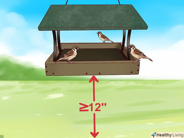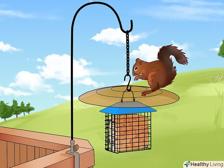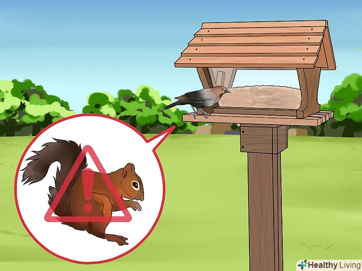 Захистіть годівницю від білок. Подумайте про використання пластикової перегородки над або під годівницею або застосовуйте спеціальний відлякуючий засіб проти білок, який безпечний для птахів, наприклад, з вмістом кайенского перцю. Підвісьте годівницю не нижче 1,2 м над землею. Якщо годівниця підвішується до дерева, вішайте її якнайдалі від стовбура. При установці годівниці на стовпчику, розміщуйте його подалі від дерев і споруд.- Додатково прочитайте статтю «як зробити, щоб білки не їли ваш пташиний корм» .