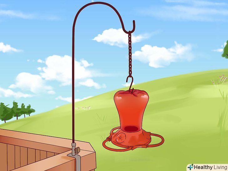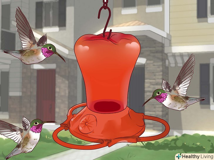 Дозвольте колібрі годуватися зНектарних годівниць . спеціально призначені для колібрі нектарні годівниці мають форму трубки з отворами. Їх слід регулярно чистити, щоб підтримувати гігієну. У зв'язку з необхідністю регулярного чищення таких годівниць, вам слід вибрати таку годівницю, яка буде легко розбиратися і митися.- Розчин цукру не тільки служить кормом для колібрі, але також сприяє розмноженню бактерій. Щоб птахи не вживали заражений бактеріями нектар, дуже важливо регулярно його міняти і мити годівницю. При прохолодній погоді (коли температура повітря нижче 21 градуса Цельсія) досить мити годівницю раз в тиждень, але якщо температура піднімається вище 32 градусів Цельсія, то ви повинні мити годівницю і оновлювати в ній нектар щодня. [4]