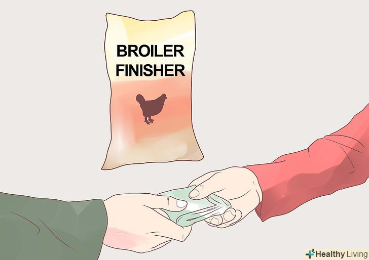 Використовуйте покупні стартові корми для м'ясних порід птиці до шеститижневого віку бройлерів. в цьому полягає їх відмінність від стартових кормів для несучок. Такі корми містять від 20 до 24 відсотків білка.- Вам знадобиться від 30 до 50 фунтів (14-23 кг) стартових кормів для бройлерів на 10 курчат.