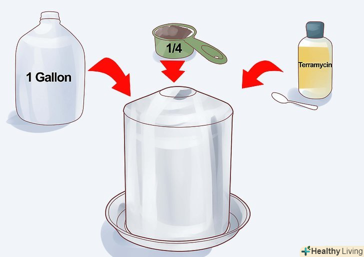 Дайте тільки вилупленим курчатам суміш з одного галону води, однієї чверті чашки цукру і, можливо, однієї чайної ложки терраміцину. Терраміцин-антибіотик, який використовується для лікування бактеріальної інфекції. [1]