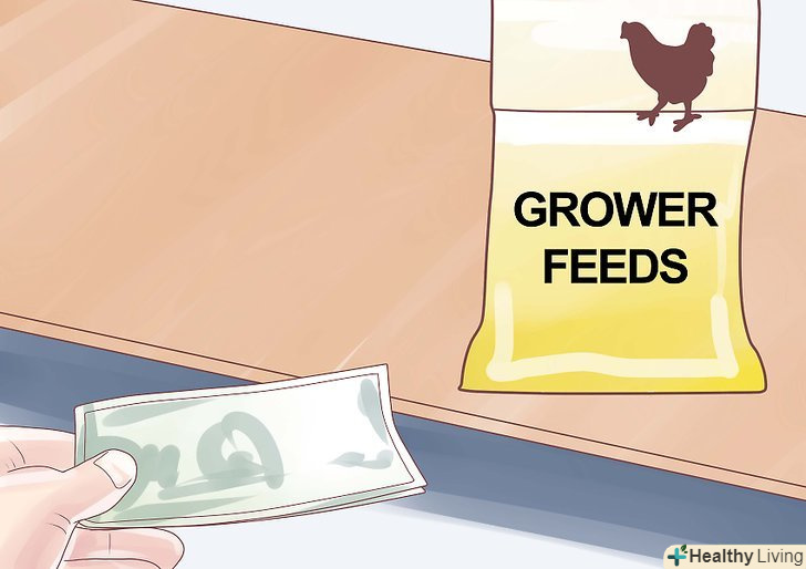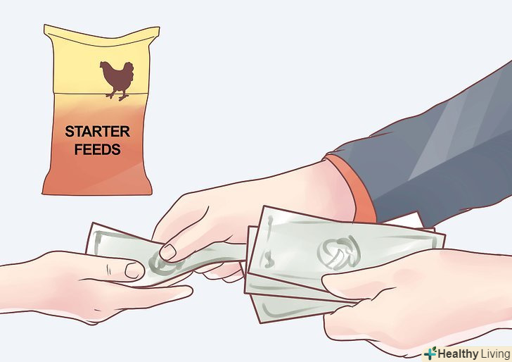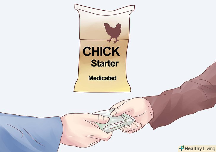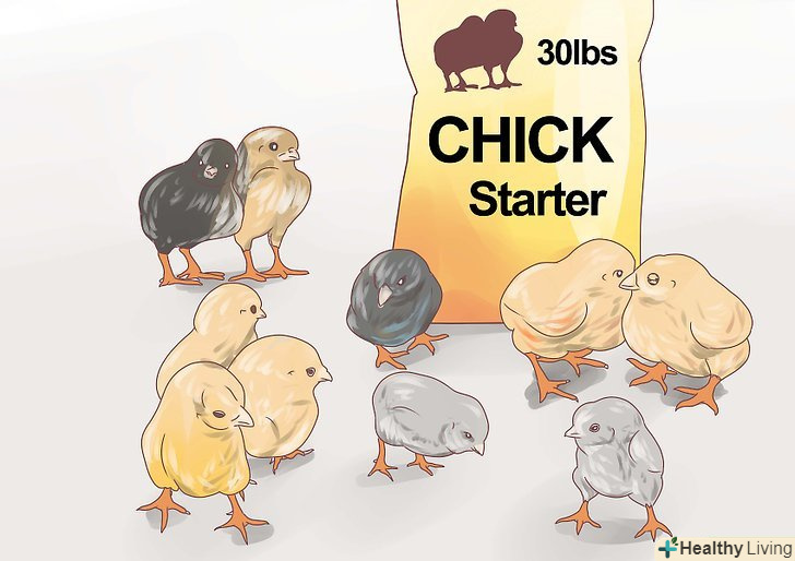Закупіть стартовий корм в спеціалізованому магазині. такі суміші містять до 20 відсотків білка, що вище, ніж в кормах, якими ви будете годувати підрослих курчат. Давайте курчатам стартовий корм з другого дня до восьми тижнів. [2]