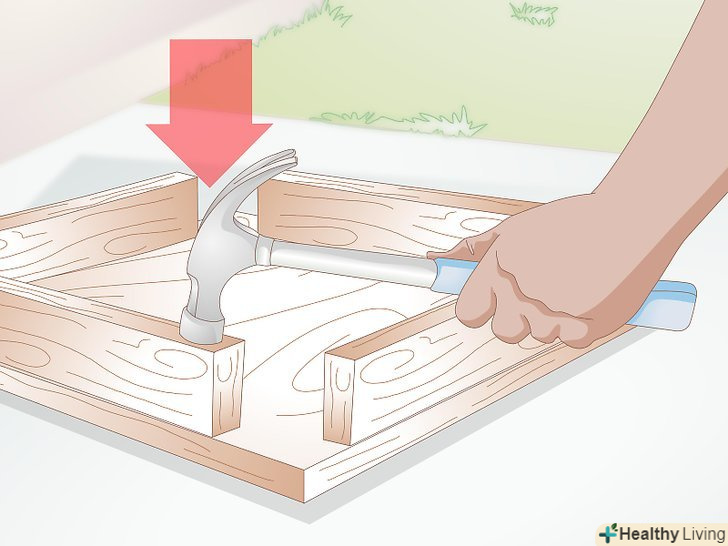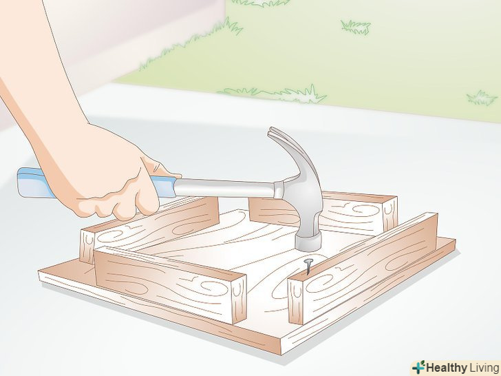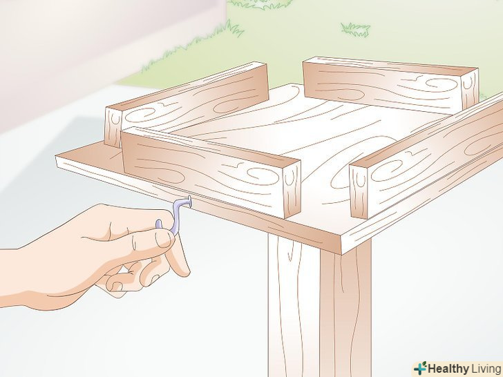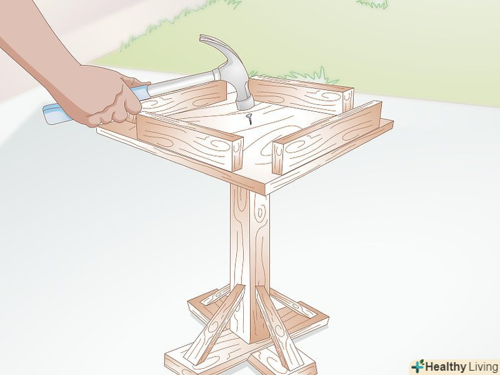 Прибийте цвяхами або приклейте рейки по краях столика. по кутах (всім або двом протилежним) залиште зазори, щоб через них можна було без праці витрусити старі зерна; вони послужать також стоком для дощової води. Прибийте цвяхами або приклейте рейки по краях столика. по кутах (всім або двом протилежним) залиште зазори, щоб через них можна було без праці витрусити старі зерна; вони послужать також стоком для дощової води.- Якщо ви використовуєте клей, переконайтеся, що він нетоксичний і зберігає свої властивості на відкритому повітрі.