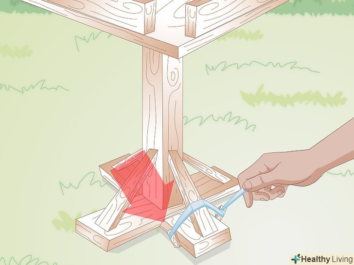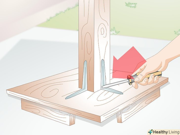 Прикріпіть столик до жердини. використовуйте для цього металеві куточки з просвердленими в них отворами для цвяхів. Слідкуйте, щоб столик утворював з жердиною прямий кут, тоді при установці він розміститься горизонтально. Прикріпіть столик до жердини. використовуйте для цього металеві куточки з просвердленими в них отворами для цвяхів. Слідкуйте, щоб столик утворював з жердиною прямий кут, тоді при установці він розміститься горизонтально.