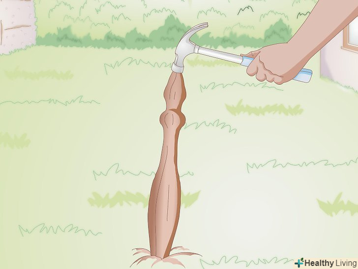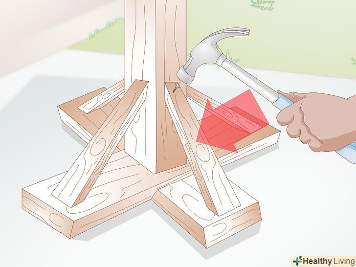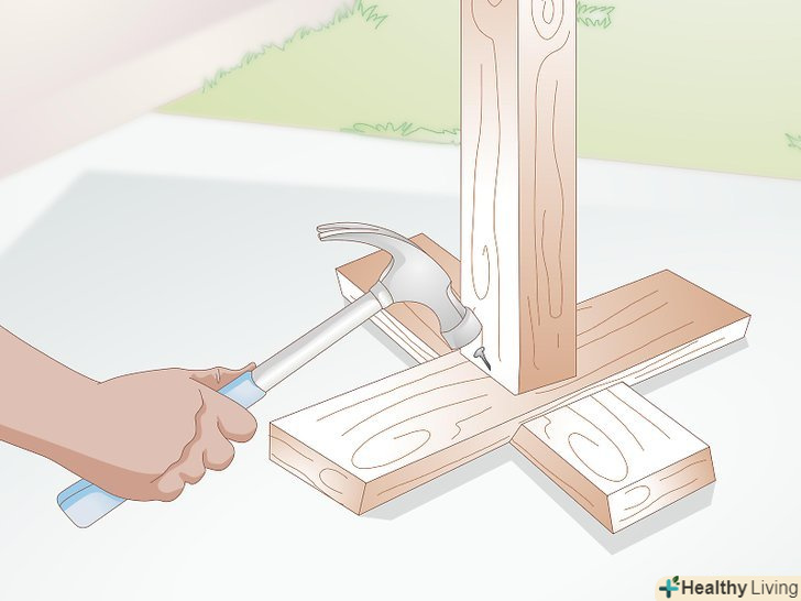 Прикріпіть фрагменти основи до жердини. Приклейте або прибийте цвяхами частини підстави до нижнього краю жердини; ці частини повинні розташовуватися перпендикулярно жердині, утворюючи фігуру у вигляді хреста. Прикріпіть фрагменти основи до жердини. Приклейте або прибийте цвяхами частини підстави до нижнього краю жердини; ці частини повинні розташовуватися перпендикулярно жердині, утворюючи фігуру у вигляді хреста.- Бруски для підстави повинні бути досить довгими, щоб утримувати жердину і розташований на ньому столик. Їх вага також повинен бути достатнім, щоб вони міцно спочивали на землі.