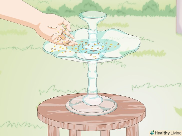 Наповніть чашку зерном і простежте, як до годівниці злетяться птиці. Наповніть чашку зерном і простежте, як до годівниці злетяться птиці.- Примітка: у разі дощу чашка і блюдце заповняться дощовою водою. Для птахів це буде хороша ванна, але після дощу слід очистити годівницю від розмоклих зерен.