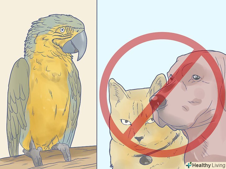 Тримайте кішок і собак подалі від ваших пернатих вихованців. Котячий інстинкт-це полювання, і їх просто не можуть не залучати літаючі малятка. Навіть' дружнє ' взаємодія з кішкою може бути смертельно небезпечним для вашої птиці! У слині і під кігтями всіх кішок є бактерії. Це абсолютно нешкідливо для кішок і це частина їх природної флори. Тим не менш, це смертельно для всіх птахів. Навіть слина, яка передається від кішки птиці (коли кішка лиже пташку або птах 'чепуриться' шерсть кішки), може привести до хвороби пернатих і вони можуть померти. Якщо ваша кішка контактувала з птахом, негайно зверніться за допомогою до ветеринара. Собаки , навіть самі слухняні, можуть злякатися і випадково атакувати або 'грати' з птахом і можуть нашкодити їй. Так що не ризикуйте! Слина кішок і собак смертельно небезпечна, оскільки вона містить багато бактерій, від яких у птахів немає імунітету. Якщо ви думаєте, що ваша пташка побувала в роті кота або собаки, негайно зверніться до ветеринара.
