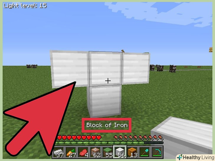 Поставте гарбуз або світильник Джека у верхній частині літери «T».тобто поставте гарбуз / світильник на центральний блок, щоб вся композиція нагадувала хрест. З'явиться Залізний голем.- Кладіть гарбуз в останню чергу; в іншому випадку Залізний голем не з'явиться.