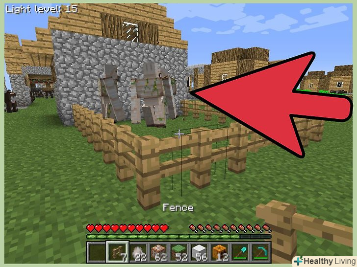 Побудуйте навколо голема паркан.зробіть це, якщо хочете, щоб голем залишався на місці, а не бродив і захищав жителів села. Залізний голем також залишиться на місці, якщо оточити свій будинок ліанами.[5]